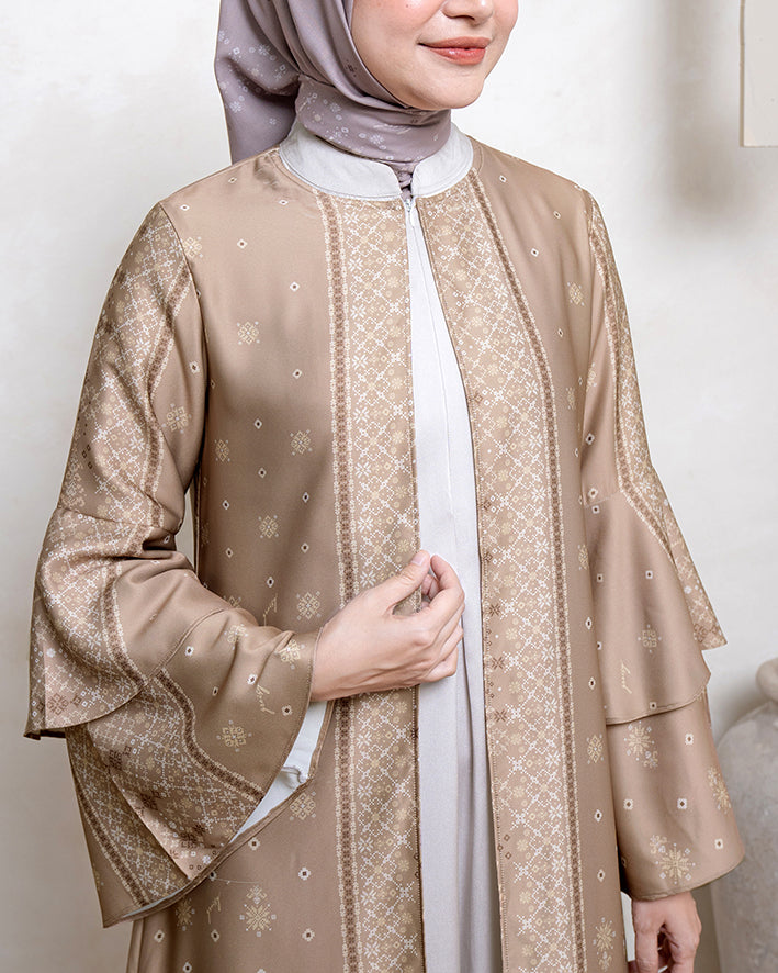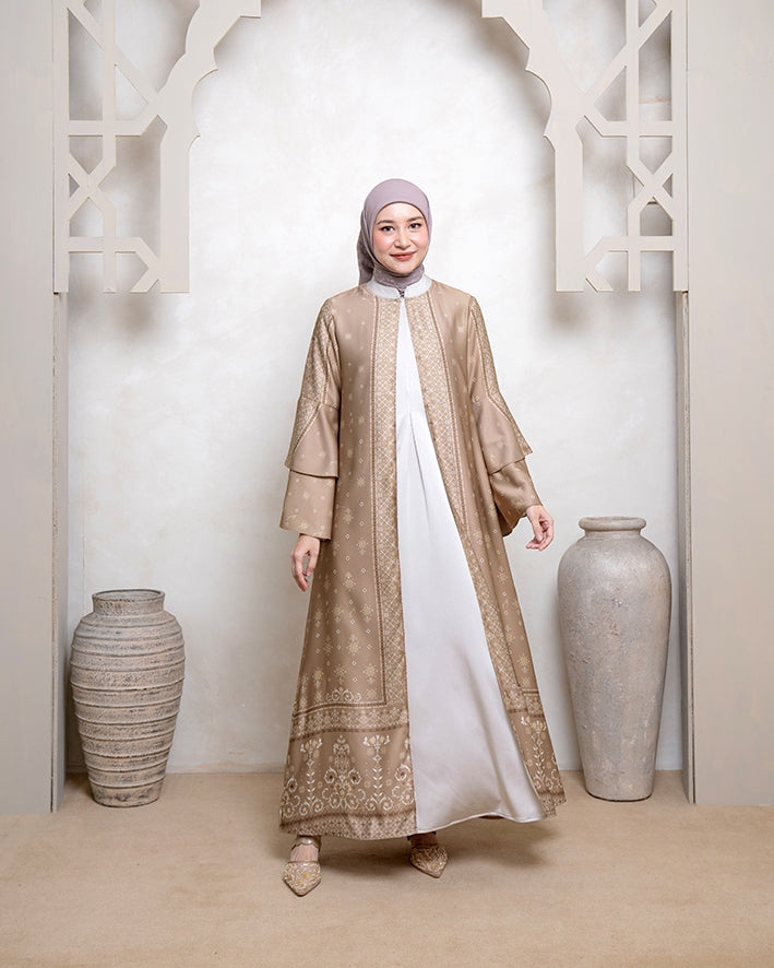 Kombinasi sempurna antara outer dengan dress dalam satu set yang memberikan tampilan anggun dan eksklusif. Padang Dress with Outerdirancang untuk menghadirkan kesan mewah dengan sentuhan pattern budaya Minangkabau yang khas. Terbuat dari material premium โFrench Silkโ yang lembut, sejuk, dan flowy, menjadikannya pilihan ideal untuk acara spesial maupun Hari Raya.