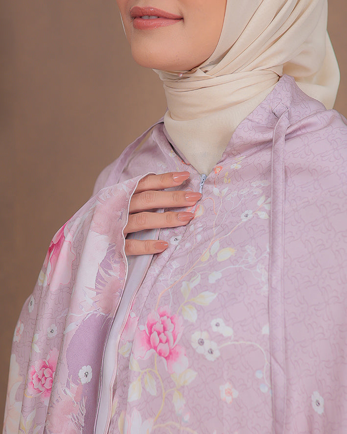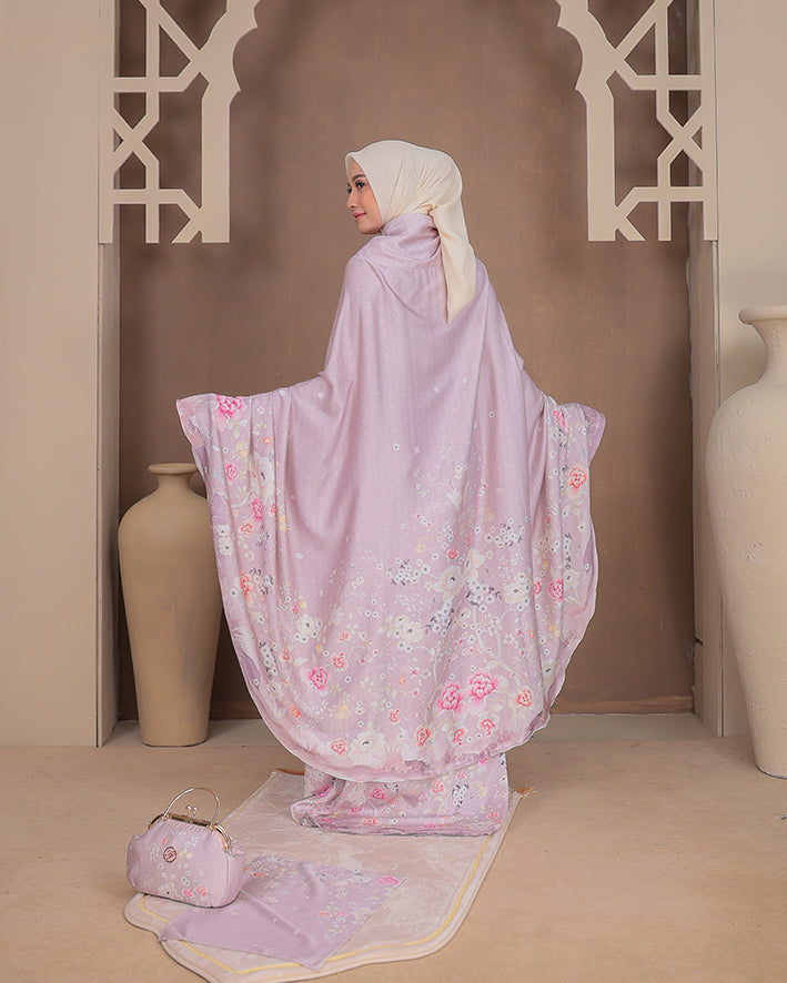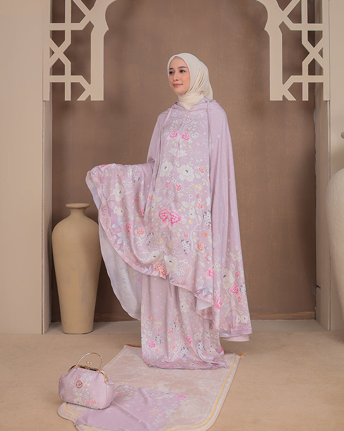 Padma Prayer Set in Peony menghadirkan nuansa feminin dan lembut. Dibuat dari material premium Armani silk yang lembut, breathable, dan flowy, memberikan kenyamanan maksimal dalam setiap ibadah.