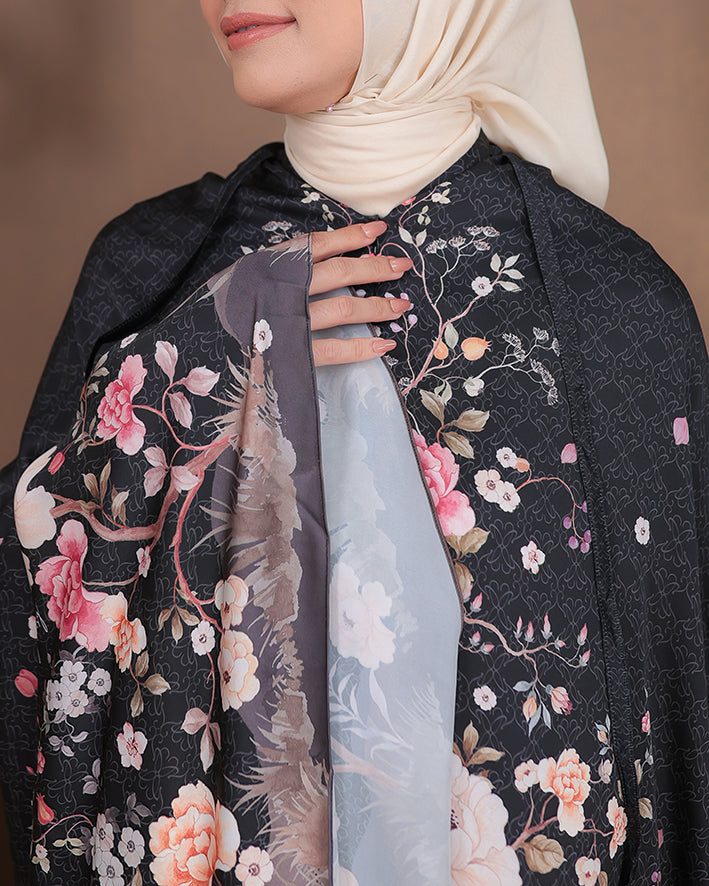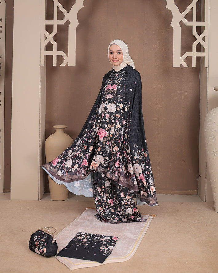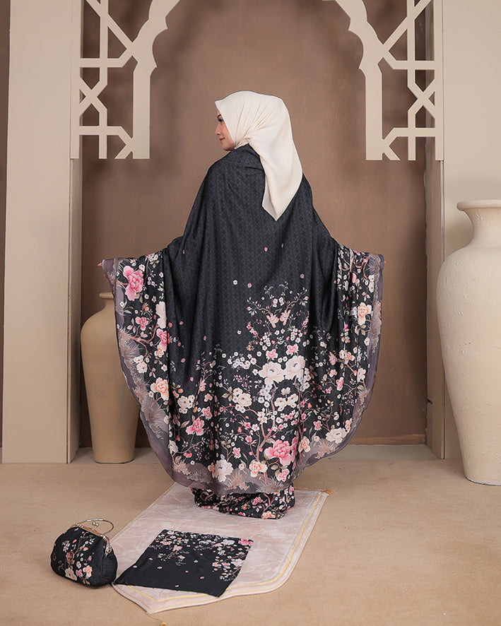 Padma Prayer Set in Raven menghadirkan kesan elegan dan klasik. Dibuat dari material premium (Armani silk) yang lembut, breathable, dan flowy, memberikan kenyamanan maksimal dalam setiap ibadah.