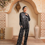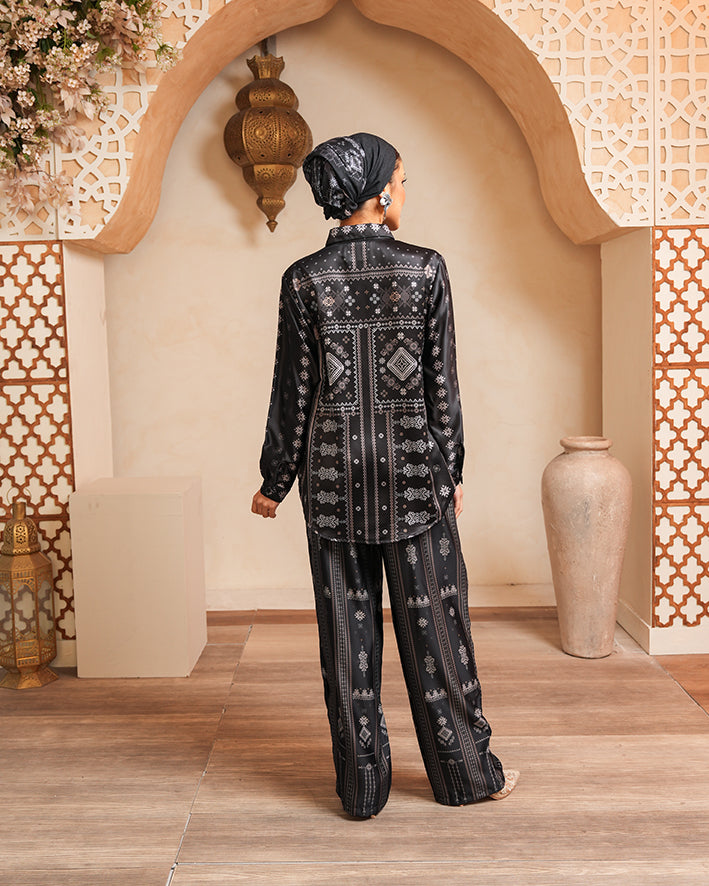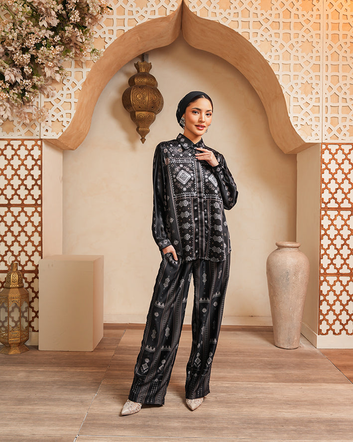 Material halus dengan subtle sheen, ringan, breathable, dan memiliki drape lembut yang jatuh sempurna, menghadirkan kesan luxury yang effortless dari day to evening look.