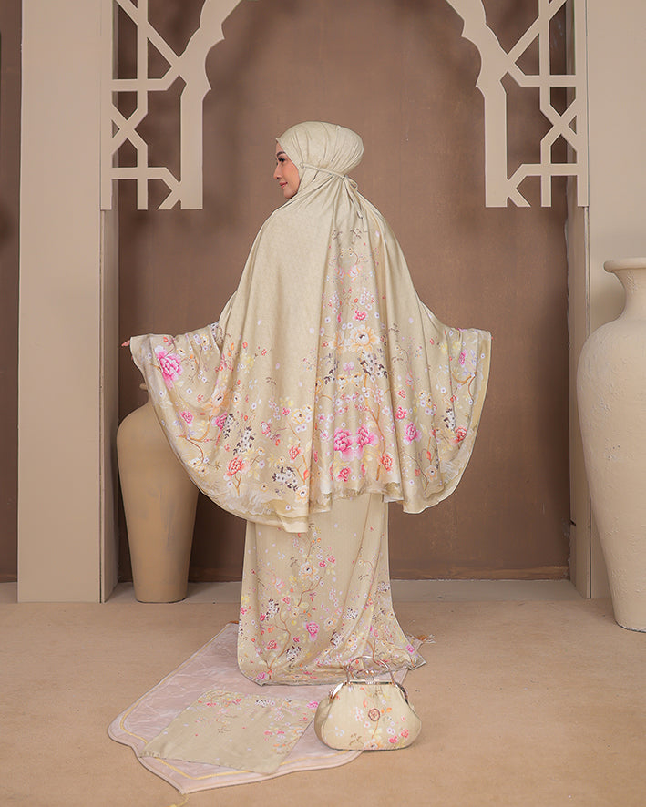 Padma Prayer Set in Gold menghadirkan nuansa mewah dan elegan. Terbuat dari material premium Armani Silk yang lembut, breathable, dan flowy, menjadikan mukena ini pilihan sempurna untuk kenyamanan beribadah.