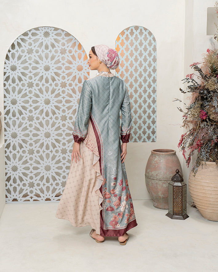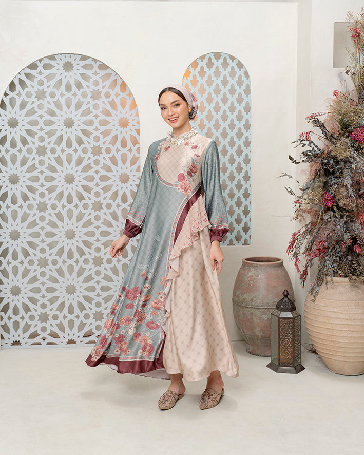 Refined Structure Silhouette: Desain panel kombinasi dengan aksen layering yang menciptakan tampilan modern-elegant, tetap modest namun statement dengan finishing polished dan graceful.